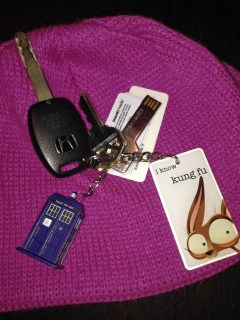 And last but not least, my keys (on top of my winter hat). I’m including them here even though they don’t always make into my bag because, yes, that’s a TARDIS. It is actually an LED flashlight and it’s dead helpful. And I love it when I have my keys out somewhere and people notice the TARDIS and comment on it. Fellow Whovians. 🙂